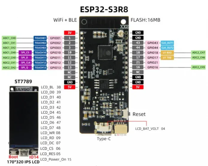 - Display – 1.9-inch 320×170 IPS full-color LCD using the ST7789V 8-bit parallel display controller