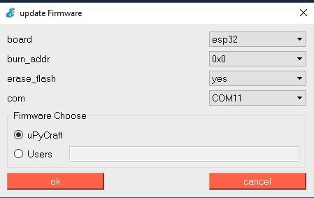 A couple of options for flashing the firmware using uPyCraft, you can let the IDE download a version or download the latest version from the micropython site and flash this to your board. The latest version of the MicroPython firmware for the ESP32 is available from the MicroPython Downloads page now scroll all the way down to the ESP32 section.