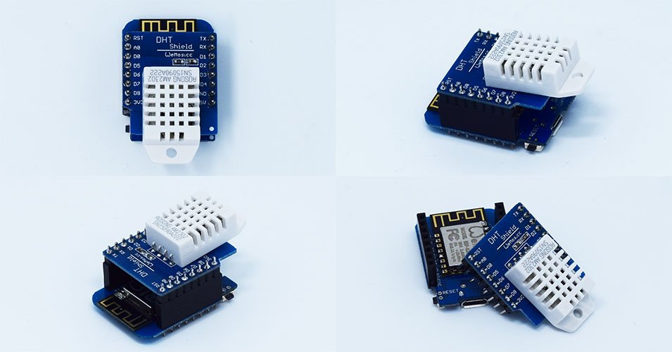 In this example we connect the DHT22 Single Bus Digital Temperature Humidity Sensor (DHT Pro shield) to our Wemos Mini , you can see this in the picture below which shows the shield